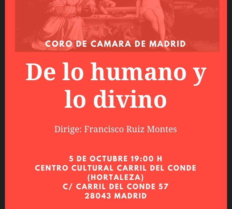 Os invitamos a nuestro próximo concierto que tendrá lugar el viernes 5 de octubre a las 19.00 horas en el Centro Cultural Carril del Conde, en Madrid. La primera parte del concierto está configurada por polifonía religiosa hispano-portuguesa, mientras que la segunda ofrece una amplia muestra del madrigal italiano y español.